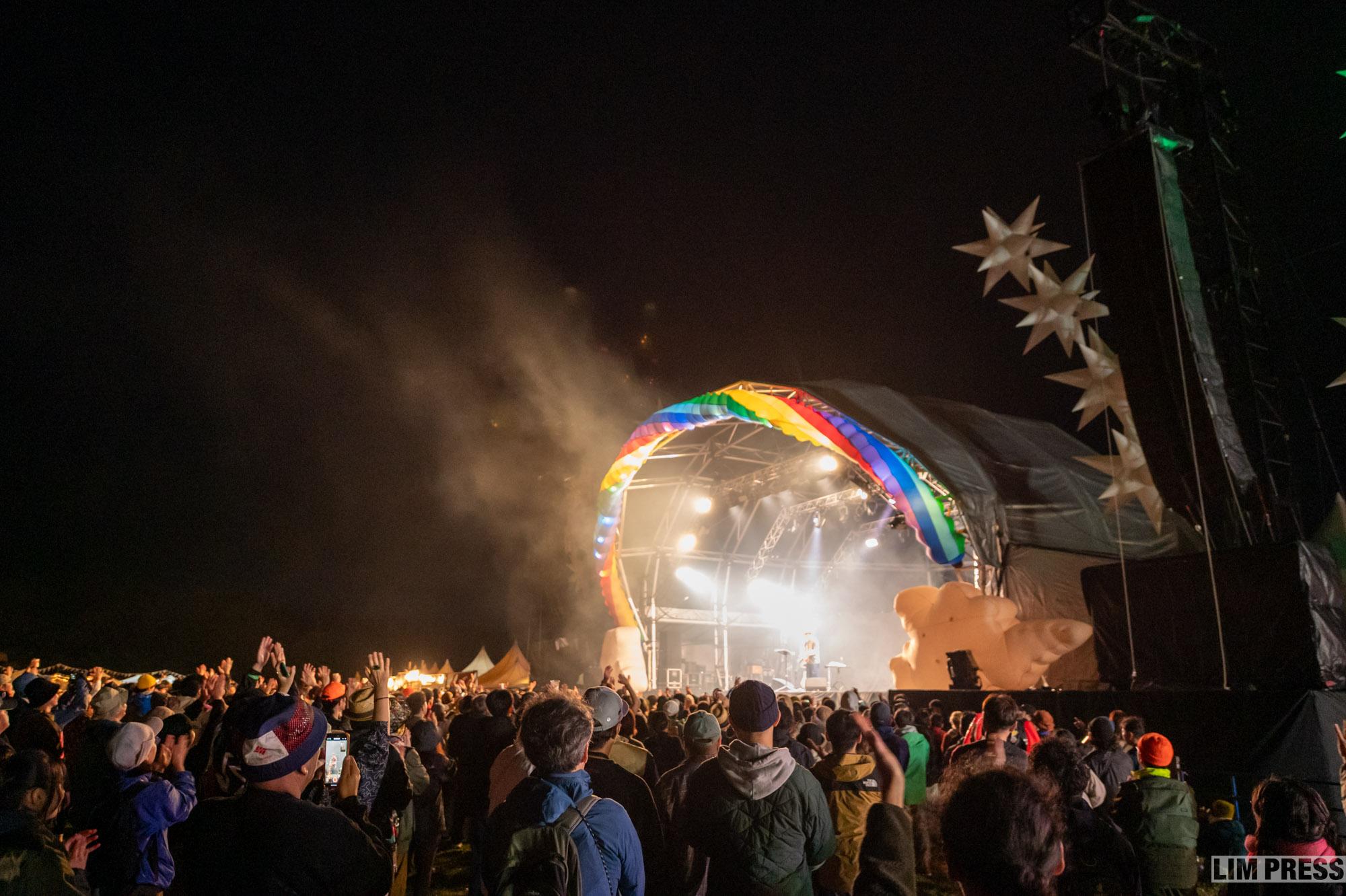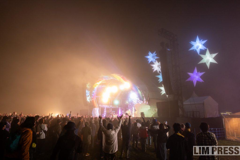 続けてレインボーステージのGLASS BEAMSがすごかった。配信で聴いていた音と比べて何倍も迫力があるうえにサイケデリックでファンクな音は朝霧の空気にすごく合っている。打ち込みの機材も使いつつ、ギター、ベース、ドラムとシンプルな編成でインドから中近東の香りを漂わせレインボーステージ前を踊らせた。