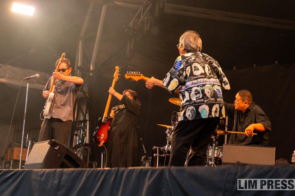 レインボーステージに戻りZAZEN BOYSに間に合う。“柔道二段”松下敦のドラムとMIYAのベースの迫力がすごい。さらに“カシオマン”吉兼聡の繊細で鋭いギターが加わり、それらをバックにして向井秀徳がギターを弾き歌いまくる。“HIMITSU GIRL’S TOP SECRET”から始まり、カシオマンの変態なギターが暴れるポップな“Weekend”、重たいファンクナンバー“安眠棒”など、朝霧でもどこでも変わらぬテンションで演奏する。“ポテトサラダ”では向井のコミカルなダンスがみられた。1945年に戦災に遭った少女の物語である“永遠少女”がすごく心に沁みてきた。現在の世界情勢にもシンクロする曲に震える。